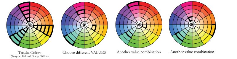 Step 2: Choose different values within that color harmony. Now, let’s say that I choose a triadic color combination. (The pink/turquoise/orange yellow is one I choose a lot, so I know I like it.) The thing about knitting, and especially color work, is that it benefits from contrast in value (lights and darks). If I chose the darkest of all three colors, my color work would look muddy and not show up very well. To avoid this, I usually choose different values of each color, or at least make sure there is some variety in the values. (There are lots of beautiful examples of low contrast color work, and that is definitely something that is fun to play with once you understand how it all plays together. If you’re looking for a starting point though, choose a variety of value for some contrast.)