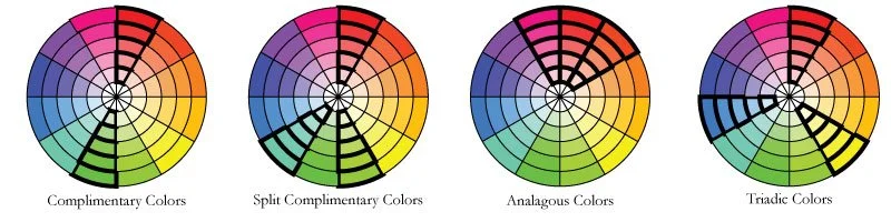 Step 1: Choose a Color Harmony. These are a few of the “color harmonies” or ways to use the color wheel to choose color combinations. These are by no way all of them, but these are a good place to start. Complimentary colors are exactly opposite from each other on the color wheel. So green and red (Christmas colors!), Yellow and purple, Turquoise and orange to name a few. These color combinations can be jarring sometimes, but play with them to see if you can make them work for you. Split complimentary softens complimentary colors just a bit by using the two colors flanking one of the complimentary colors - so instead of red and green, the combination becomes red, turquoise and chartreuse. Analogous is a safe bet - just choose colors that are next to each other on the color wheel. Triadic colors form a triangle on the color wheel.